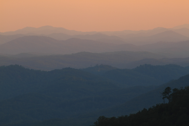 Dusk falls over the Great Smoky Mountains National Park. Canon 7D with Canon EF 100-400mm f/4.5-5.6L lens at ISO 100.
