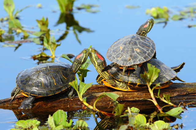 I took this picture on Valentine's Day of two red-eared slider's "smooching" (please indulge my foray into anthropomorphism) - must be a real "toe-curler" of a kiss (check out the right-rear foot of the big one on the right).
