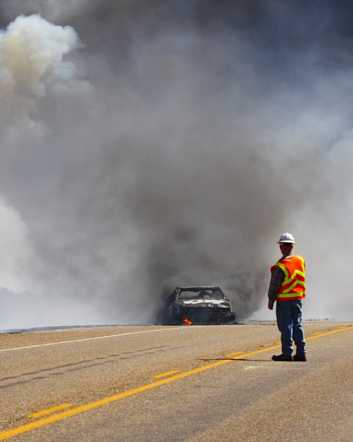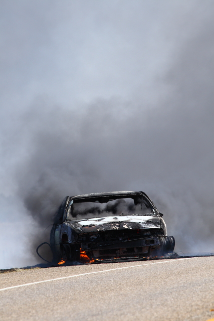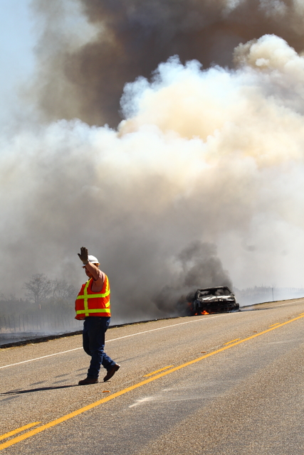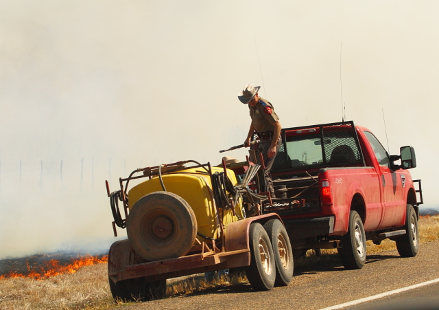 First attempt to inhibit the fire and restrict it to the short side-of-the-highway grass ©Andrew McInnes. All rights reserved.