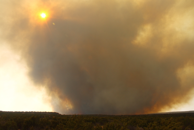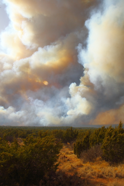 Fire "jumped" the breaks beyond the grass and is now fueled by abundant juniper ©Andrew McInnes. All rights reserved.