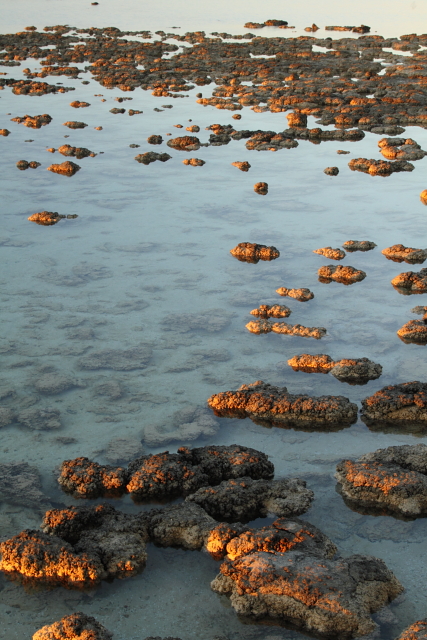 The next series shows Thrombolites at Lake Clifton, Western Australia – the largest reef of living thrombolites in the southern hemisphere. Thrombolitic structures have an internal clotted structure (as opposed to those that have a laminated organisation, which are stromatolitic – next series of images) and are formed through precipitation of calcium carbonate within the microenvironment by microbes as a result of photosynthetic and metabolic activity (source: Hilary Wheater, “Thrombolites of Lake Clifton.” 2010).