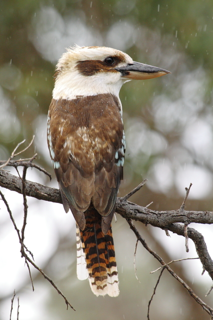 Laughing Kookaburra perusing its surrounds for prey items in the rain.
