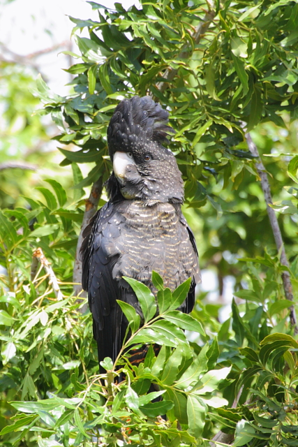 Another view of the Red-tailed Black-Cockatoo (male) that features the red tail feathers – at the University of Western Australia.