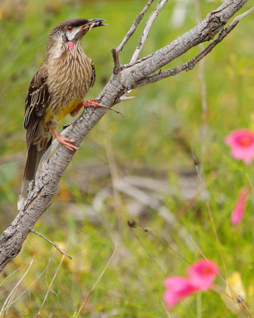 Although primarily a “honeyeater”, the Red Wattle Bird also eats a variety of insects which are often caught mid-air, and also some fruit.