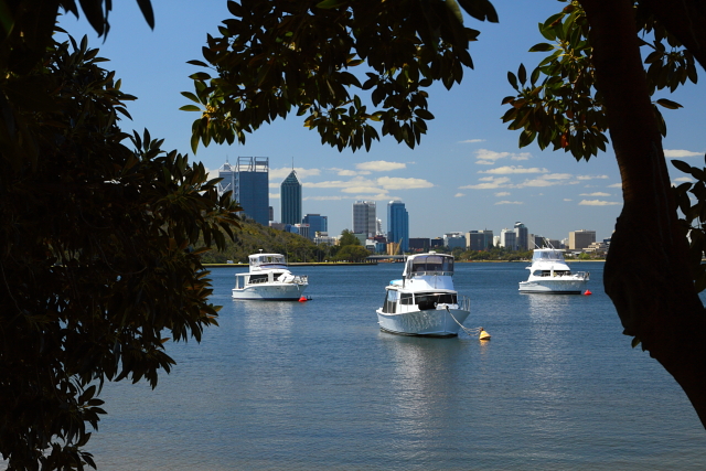 Perth, the Swan River, and a bevy of the river’s namesake (Black Swan) – viewed from Matilda Bay.