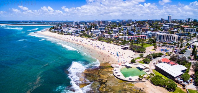 These aerial (drone) scenes include Kings Beach, Wickham Headland, Shelly Beach, Moffat Headland, Pumicestone Passage, Bribie Island, the Glasshouse Mountains (in the background), and Caloundra – on the Sunshine Coast of Queensland.