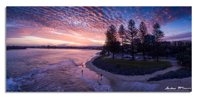 A series of aerial images capturing the sunset progression of a stunning winter ‘mackerel sky’ over Pumicestone Passage and Happy Valley, Caloundra.
