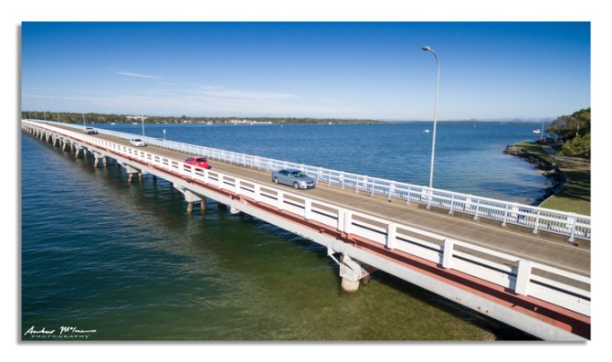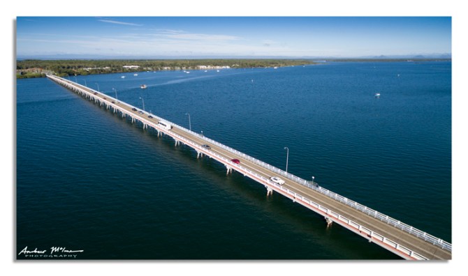 A series of aerial (drone) images of the Bribie Island bridge and Pumicestone Passage, Queensland.