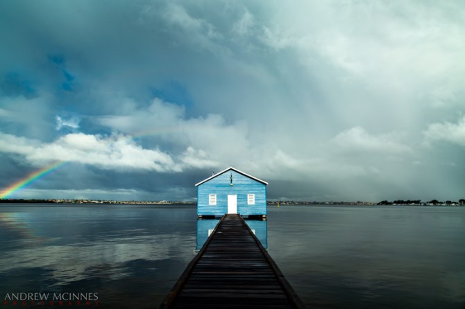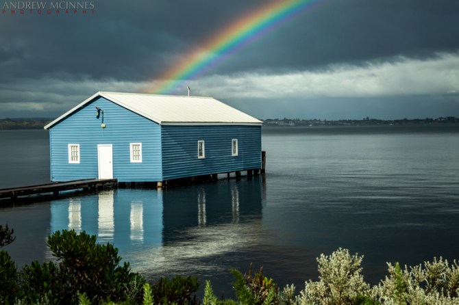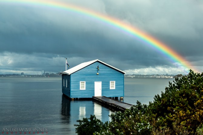 Sun and rain and rainbow over the Crawley Edge Boatshed. This little boathouse is a magnet for the “insta” crowd, with crowds lined up daily to get their images here.