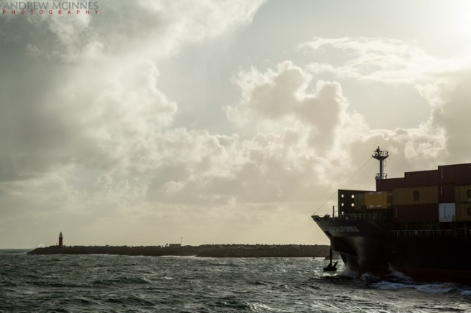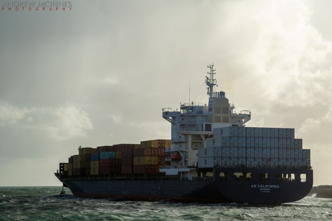 A Madeira registered container ship departs the Port of Fremantle, Western Australia.