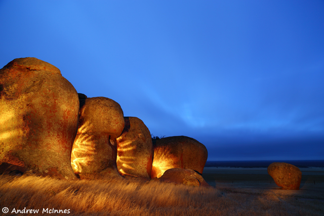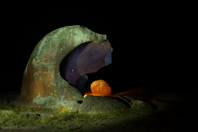 For this first image I wanted to create a look of Aboriginal rock art being illuminated by fires in the recesses between the boulders. This is a stacked image.
