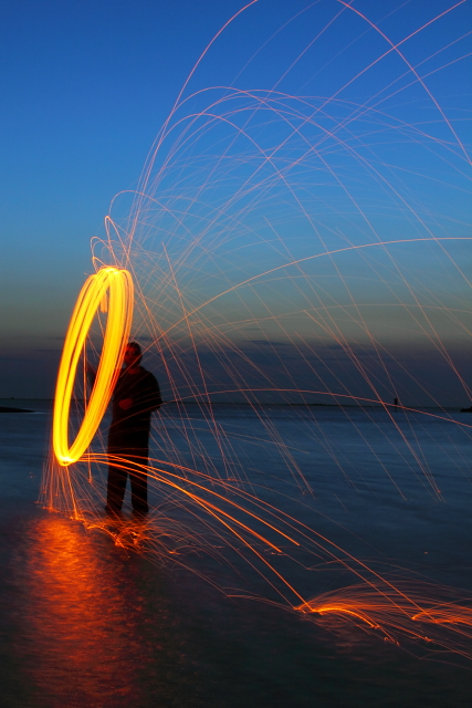We had a blast experimenting with this – thanks to Jeremy Caton for his self-sacrificing work “spinning the fire” (his hands are all torn up from the rotating cable – there will be gloves next time). NOTE: The use of this steel-wool technique requires locations that will not be conducive to ignition and subsequent fire!