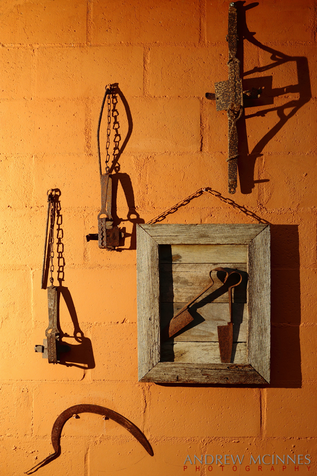 Times of yore;  traps, sickles, and shears adorn the bistro wall.