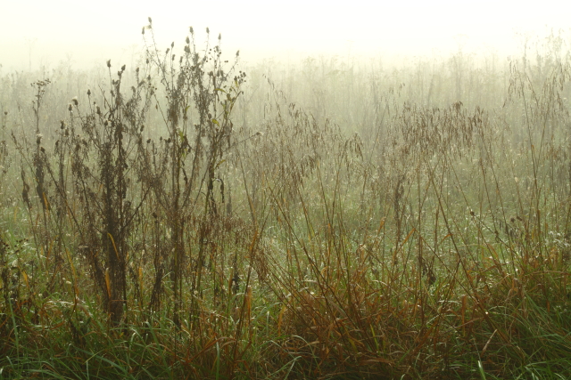 Morning light flashes the prairie through the fog.