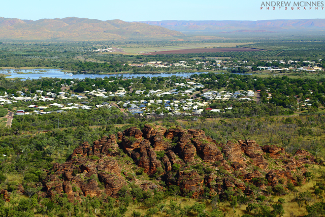 Here is the ‘mini Bungle Bungles’ (a portion of Mirima/Hidden Valley), viewed from a helicopter, including the town of Kununurra, Lily Creek, Indian Sandalwood plantations, and a portion of the surrounding ranges.